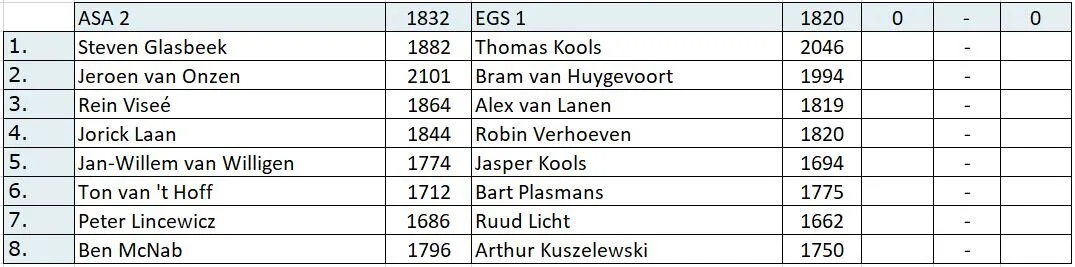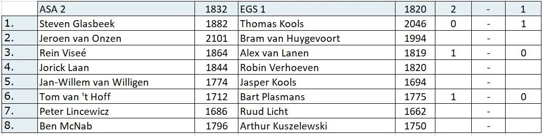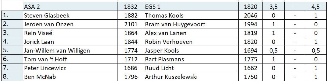 Jorick verliest uiteindelijk en Ben deelt in de malaise en verliest helaas ook. Daarmee wordt de eindstand 3,5-4,5.