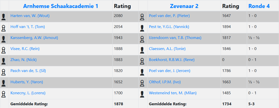 Als er een prijs zou zijn voor de leukste partij, dan zou Rein die wat mij betreft hebben gewonnen. In een zeer goede stelling met een pion meer offerde hij een paard op d6 en dat leek (voor mij) keihard te winnen. Maar zwart had wat tegendreigingen en het bleek lastig om die te pareren en tegelijk de eigen aanval in leven te houden. De verdediging had zwart alleen wel veel tijd gekost en onder tijdsdruk blunderde hij daardoor een stuk weg.