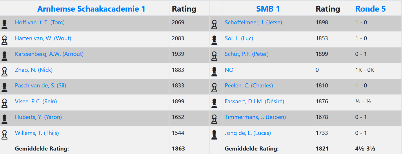 Op 6 februari nam ASA 1 het op tegen SMB 1. Het beloofde een spannende ronde te worden, aangezien beide teams een gelijk aantal punten hadden. Bovendien was Lorens ziek, waardoor we op bord 8 met een invaller speelden.